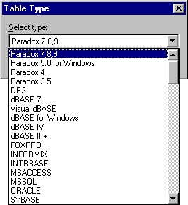 Po odklepnutí tlačítka Blank se zobrazí dialogové okno, ve kterém musíme zvolit typ tabulky - volíme Paradox 7,8,9 (viz obr. 2-122 na následující straně).