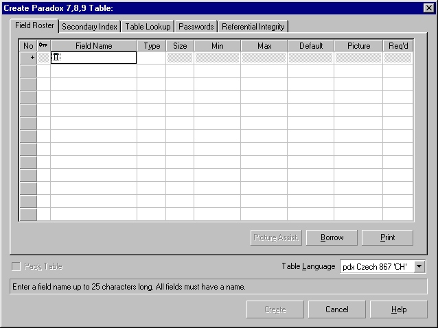Po volbě typu tabulky se již zobrazí dialogové okno se zobrazenou kartou Field Roster, která obsahuje tabulku, do které zapisujeme strukturu tabulky (viz obr. 2-123 na následující straně).