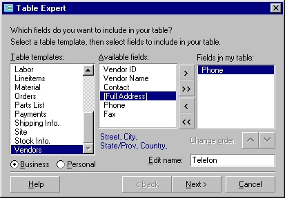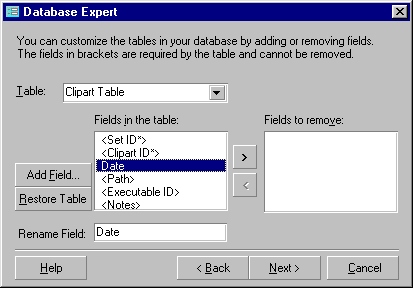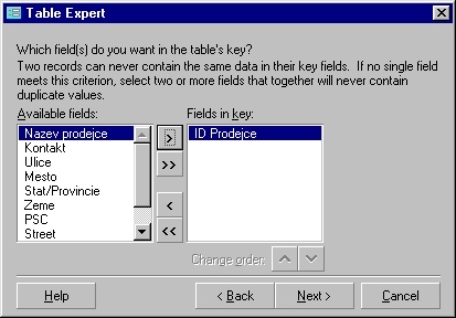 Upravovanou tabulku volíme v rozbalovacím seznamu Table. V seznamu nadepsaném slovy Fields in the table se můžeme seznámit s položkami, které expert do jednotlivých tabulek umístil. Do nerovnostních znamének jsou umístěny položky, které nemůžeme odstranit ani přejmenovat (klíčové a propojovací položky). Položky odstraňujeme ze seznamu pomocí přemístění do seznamu vpravo - seznam Fields to remove. A z tohoto seznamu je můžeme opět vrátit do položek tabulky (poklepání nebo tlačítka s nerovnostními znaménky). Přejmenovat položku (pro kterou je to samozřejmě povoleno) můžeme v poli Rename Field. Pokud nám nějaká položka ve struktuře tabulky chybí, přidáme ji po odklepnutí tlačítka Add Field... Položku volíme ze seznamu všech položek všech tabulek experta (viz obr. 2-116 na následující straně).