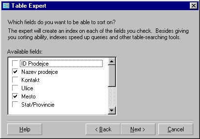V následujícím okně (viz obr. 2-109 na následující straně) můžeme zaškrtnout u všech položek, podle kterých se má třídit - budou podle nich vytvořeny sekundární indexy. Odklepnutím tlačítka Next > přejdeme do posledního dialogového okna tabulkového experta (viz obr. 2-110 na následující straně).