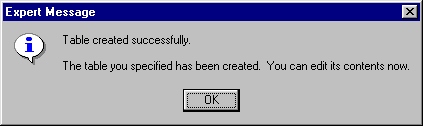 Po odklepnutí tlačítka Finish je tabulka vytvořena a pokračuje se podle volby v posledním dialogovém okně. Vytvoření tabulky oznámí hlášení experta.