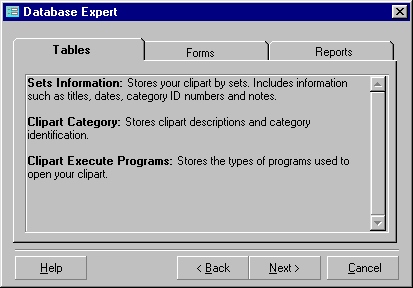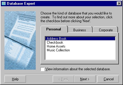 Databázový expert je podstatně komplexnější než tabulkový expert. Zatímco tabulkový expert nám dovolil vytvořit jednu tabulku, definovat klíče a případné sekundární indexy, pomocí databázového experta můžeme definovat celou aplikaci. To znamená nejen tabulky, ale i referenční integrity mezi nimi, formuláře, sestavy, dotazy a programový kód, prostřednictvím kterého celou aplikaci ovládáme.