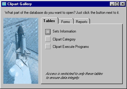 Současně se spustí formulář, prostřednictvím kterého můžeme pracovat s vytvořenou databází. Vše je vytvořeno tak, abychom se mohli na vytvořené objekty podívat a zjistit, jaké příkazy jsou doplněny pro požadovanou funkčnost. Jako poslední obrázek si ukažme vzhled spouštěcího formuláře aplikace Clipart Gallery (viz obr. 2-120).